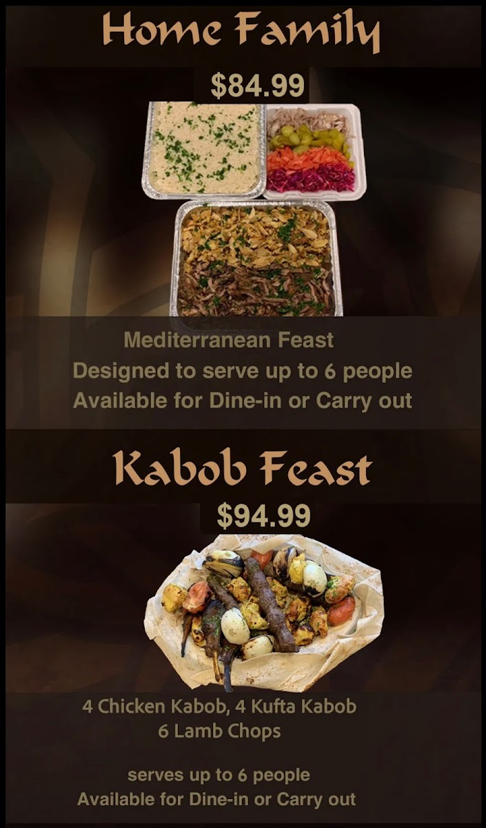 Serves 25 people. Mix of chicken and kufta kabob and includes rice, grilled onions and tomato, a tray of fattoush, yogurt sauce, and pita.